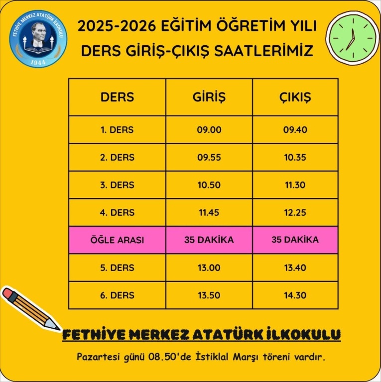 2025-2026 Eğitim-Öğretim Yılı ders giriş - çıkış saatleriniz.